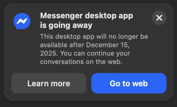 Facebook gửi thông báo ngừng hỗ trợ ứng dụng Messenger cho máy tính, bao gồm macOS và Windows kể từ ngày 15/12, yêu cầu người dùng chuyển sang giao diện web để tiếp tục sử dụng - Ảnh chụp màn hình