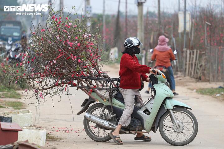 Từ sáng sớm đến chiều muộn, dòng người và xe cộ ra vào làng đào Nhật Tân tấp nập, kéo dài hai bên trục đường chính, tạo nên khung cảnh nhộn nhịp báo hiệu mùa xuân đang đến rất gần.