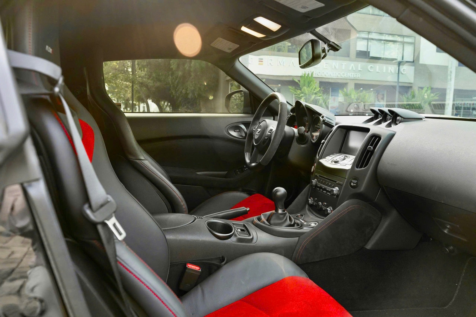 Bên trong cabin, Nissan 370Z Nismo hướng tới trải nghiệm vận hành nên dùng ghế thể thao của Recaro bọc Alcantara phối hai tông màu, ôm sát cơ thể. Vô-lăng thể thao cũng được bọc bằng chất liệu tương tự. Tiện nghi như khởi động nút bấm, hệ thống âm thanh Bose 6 loa, màn hình giải trí trung tâm có những kết nối cơ bản đều có mặt để đáp ứng nhu cầu sử dụng hàng ngày.