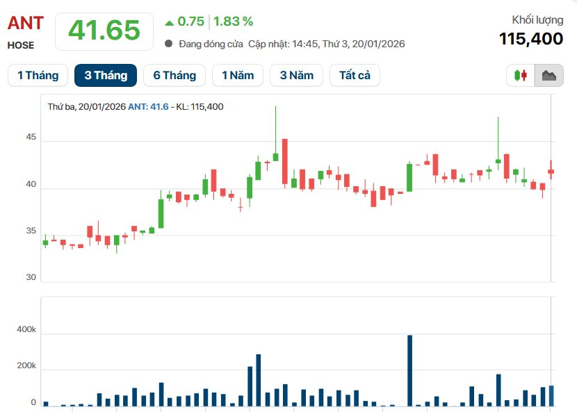 Kết thúc phiên giao dịch đầu tiên, ANT đóng cửa ở mức 41.650 đồng/cp, tăng 1,83% so với giá tham chiếu. Khối lượng giao dịch đạt 115.400 đơn vị, thanh khoản ổn định phản ánh tâm lý nắm giữ của nhà đầu tư đối với doanh nghiệp có nền tảng cơ bản tốt. Tại mức giá này, vốn hóa thị trường của Antesco đạt 1.002 tỷ đồng.