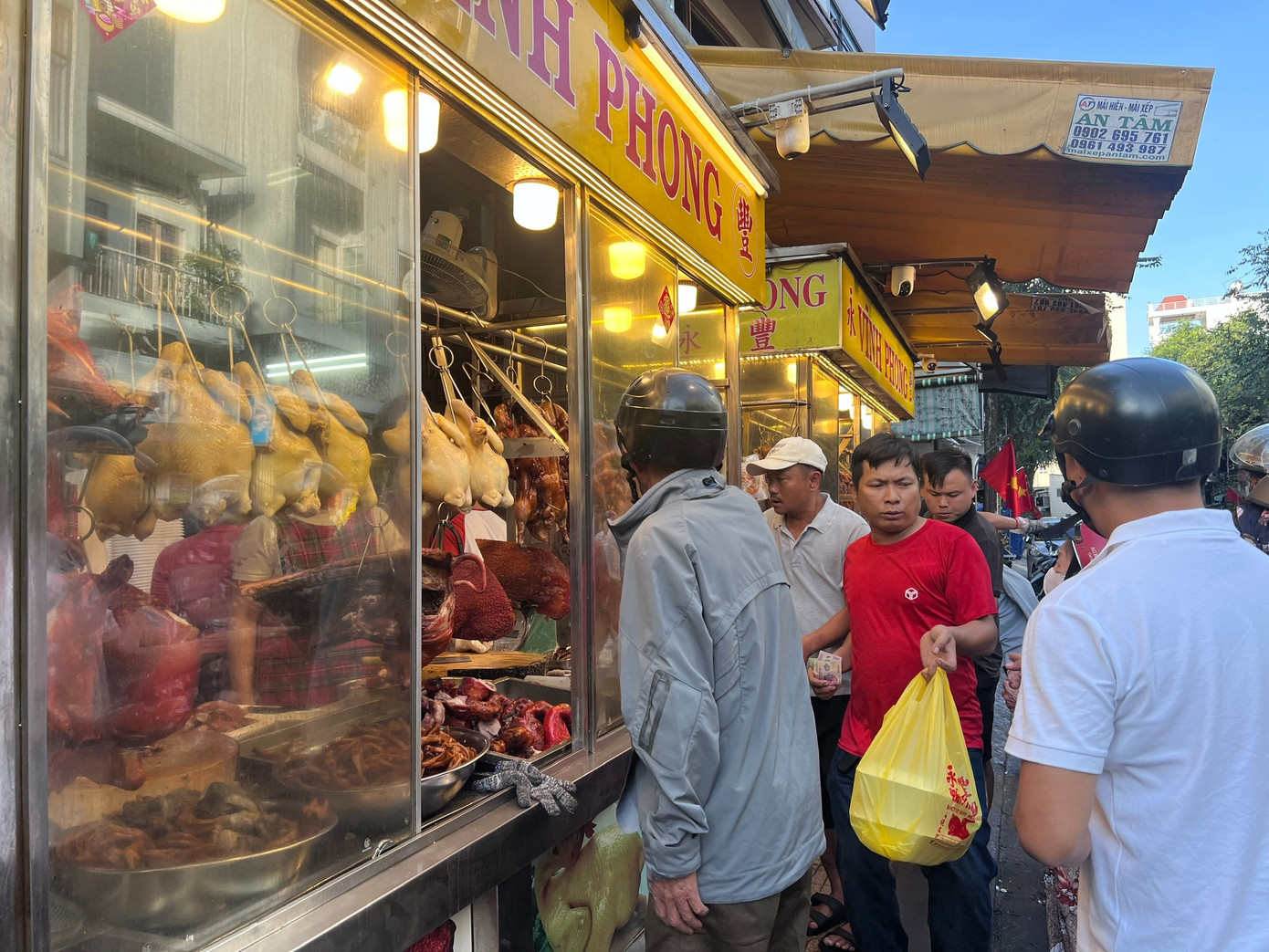 Sáng mùng 3 Tết, không khí mua sắm lễ vật trên nhiều tuyến đường ở TPHCM trở nên nhộn nhịp, nhiều gia đình chọn gà luộc, vịt quay về làm lễ hóa vàng - nghi thức tiễn ông bà sau những ngày sum họp đầu năm. Các điểm bán hoạt động liên tục, nhân viên tất bật đóng gói, giao hàng để kịp giờ cúng trưa.