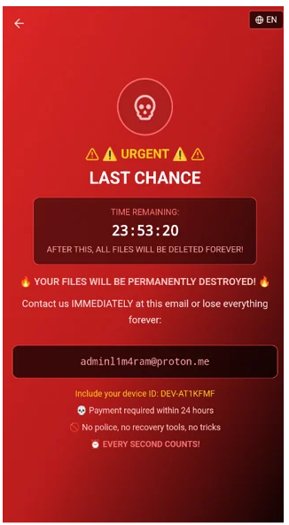 Trên thiết bị bị nhiễm, DroidLock hiển thị thông báo tống tiền với thời hạn ngắn, thường bắt đầu từ 24 giờ , kèm theo cảnh báo dữ liệu sẽ bị xóa vĩnh viễn nếu nạn nhân không liên hệ và thanh toán tiền chuộc đúng hạn.